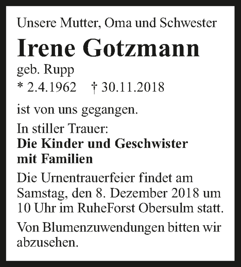 Hier finden Sie alle Traueranzeigen aus der Zeitung, die bisher für Irene Gotzmann erschienen sind. Weitere Traueranzeigen, die in der Zeitung erscheinen, werden hier ebenfalls aufgelistet