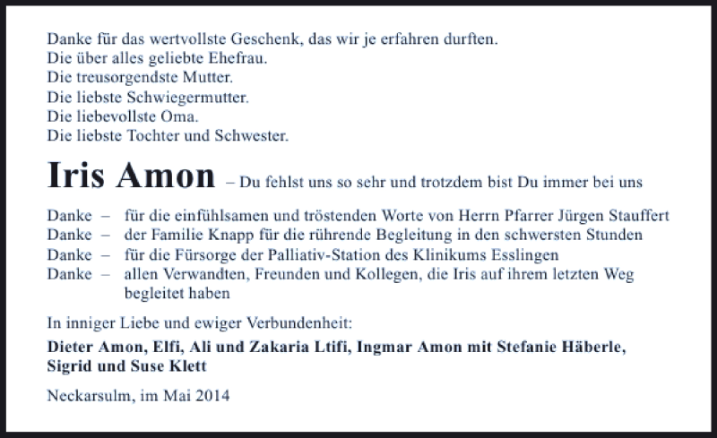 Hier finden Sie alle Traueranzeigen aus der Zeitung, die bisher für Iris Amon erschienen sind. Weitere Traueranzeigen, die in der Zeitung erscheinen, werden hier ebenfalls aufgelistet