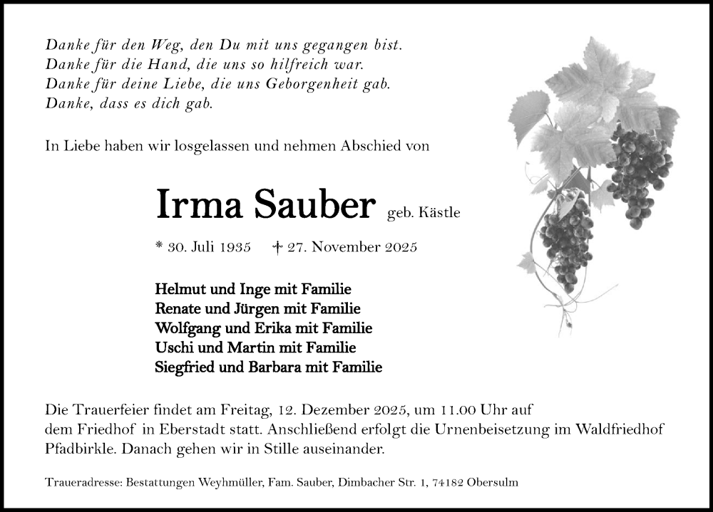 Hier finden Sie alle Traueranzeigen aus der Zeitung, die bisher für Irma Sauber erschienen sind. Weitere Traueranzeigen, die in der Zeitung erscheinen, werden hier ebenfalls aufgelistet