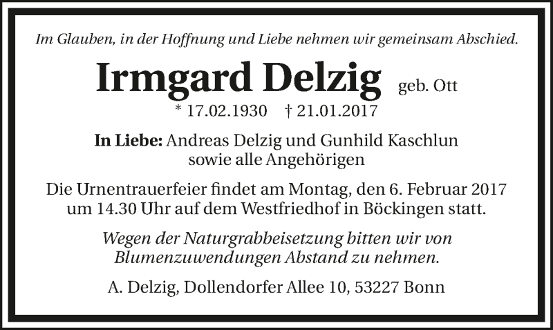 Hier finden Sie alle Traueranzeigen aus der Zeitung, die bisher für Irmgard Delzig erschienen sind. Weitere Traueranzeigen, die in der Zeitung erscheinen, werden hier ebenfalls aufgelistet