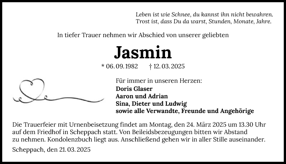Hier finden Sie alle Traueranzeigen aus der Zeitung, die bisher für Jasmin Glaser erschienen sind. Weitere Traueranzeigen, die in der Zeitung erscheinen, werden hier ebenfalls aufgelistet