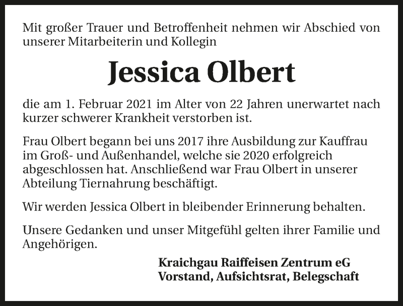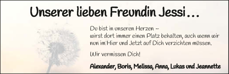 Hier finden Sie alle Traueranzeigen aus der Zeitung, die bisher für Jessica Olbert erschienen sind. Weitere Traueranzeigen, die in der Zeitung erscheinen, werden hier ebenfalls aufgelistet