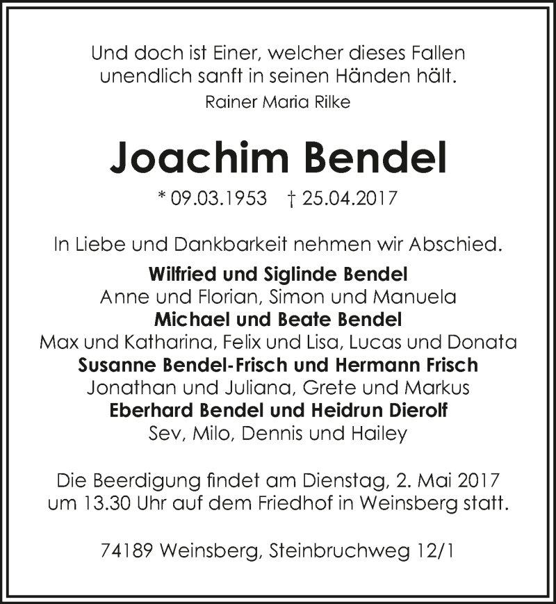 Hier finden Sie alle Traueranzeigen aus der Zeitung, die bisher für Joachim Bendel erschienen sind. Weitere Traueranzeigen, die in der Zeitung erscheinen, werden hier ebenfalls aufgelistet