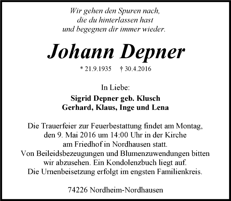 Hier finden Sie alle Traueranzeigen aus der Zeitung, die bisher für Johann Depner erschienen sind. Weitere Traueranzeigen, die in der Zeitung erscheinen, werden hier ebenfalls aufgelistet