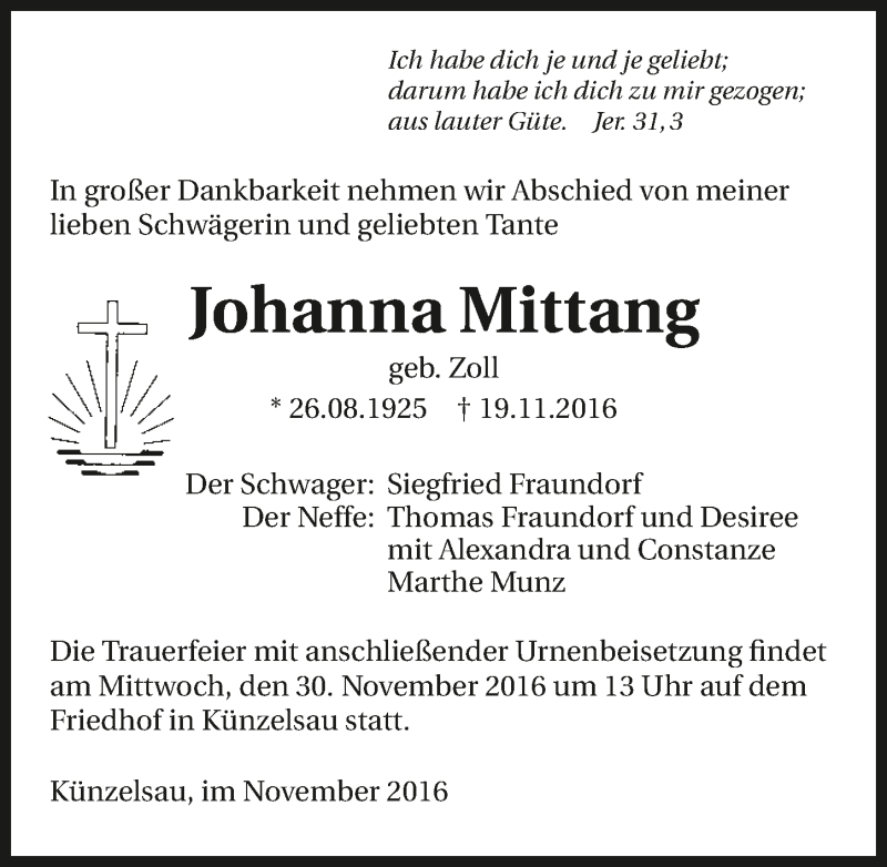 Hier finden Sie alle Traueranzeigen aus der Zeitung, die bisher für Johanna Mittang erschienen sind. Weitere Traueranzeigen, die in der Zeitung erscheinen, werden hier ebenfalls aufgelistet