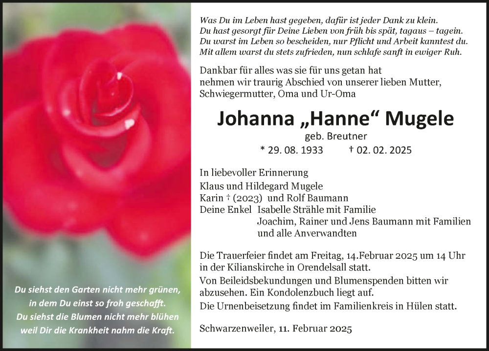 Hier finden Sie alle Traueranzeigen aus der Zeitung, die bisher für Johanna Mugele erschienen sind. Weitere Traueranzeigen, die in der Zeitung erscheinen, werden hier ebenfalls aufgelistet