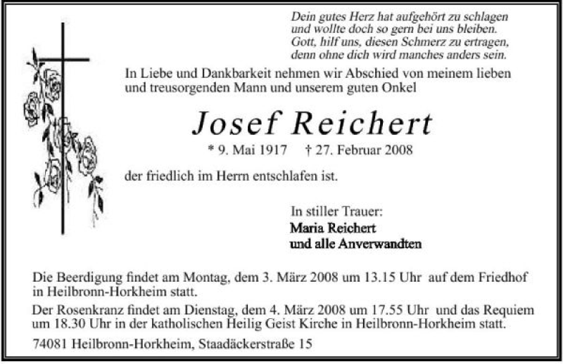 Hier finden Sie alle Traueranzeigen aus der Zeitung, die bisher für Josef Reichert erschienen sind. Weitere Traueranzeigen, die in der Zeitung erscheinen, werden hier ebenfalls aufgelistet