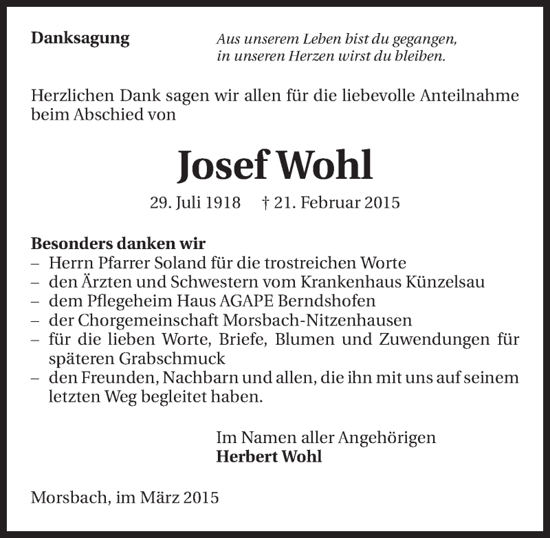Hier finden Sie alle Traueranzeigen aus der Zeitung, die bisher für Josef Wohl erschienen sind. Weitere Traueranzeigen, die in der Zeitung erscheinen, werden hier ebenfalls aufgelistet