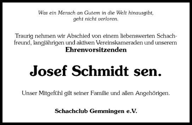 Hier finden Sie alle Traueranzeigen aus der Zeitung, die bisher für Josef sen Schmidt erschienen sind. Weitere Traueranzeigen, die in der Zeitung erscheinen, werden hier ebenfalls aufgelistet