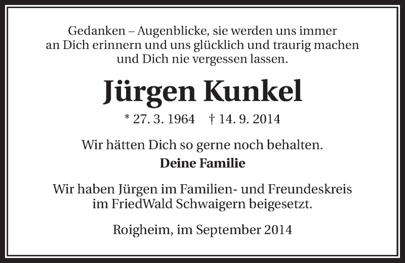 Hier finden Sie alle Traueranzeigen aus der Zeitung, die bisher für Jürgen Kunkel erschienen sind. Weitere Traueranzeigen, die in der Zeitung erscheinen, werden hier ebenfalls aufgelistet