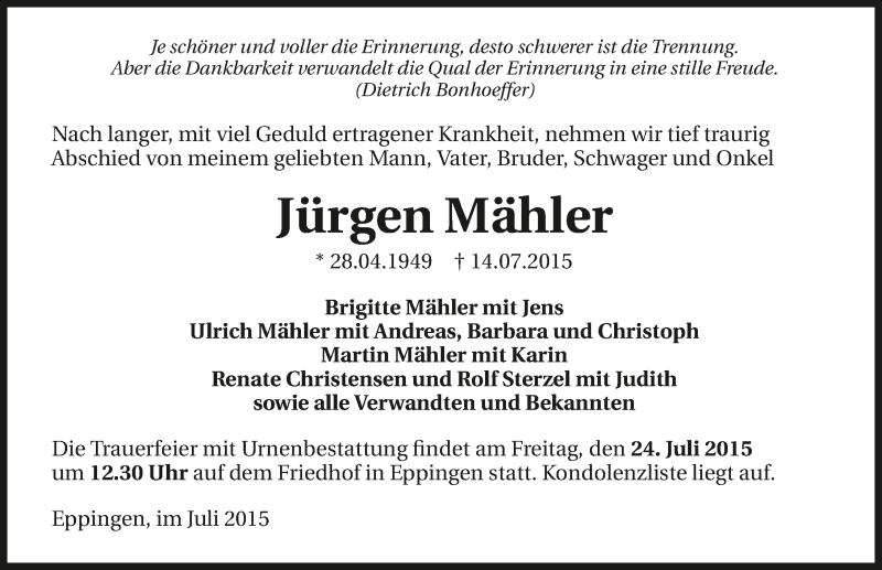 Hier finden Sie alle Traueranzeigen aus der Zeitung, die bisher für Jürgen Mähler erschienen sind. Weitere Traueranzeigen, die in der Zeitung erscheinen, werden hier ebenfalls aufgelistet