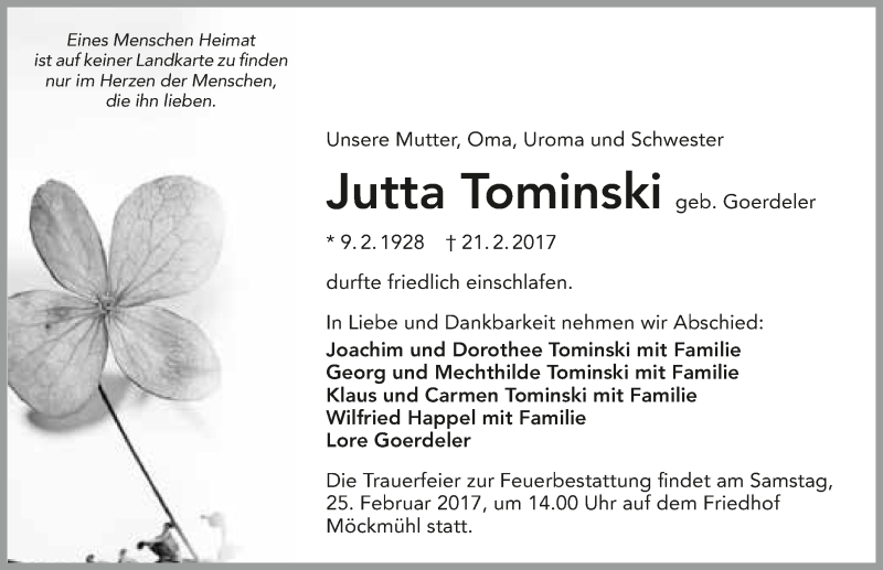 Hier finden Sie alle Traueranzeigen aus der Zeitung, die bisher für Jutta Tominski erschienen sind. Weitere Traueranzeigen, die in der Zeitung erscheinen, werden hier ebenfalls aufgelistet