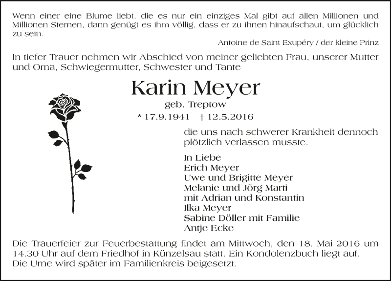 Hier finden Sie alle Traueranzeigen aus der Zeitung, die bisher für Karin Meyer erschienen sind. Weitere Traueranzeigen, die in der Zeitung erscheinen, werden hier ebenfalls aufgelistet