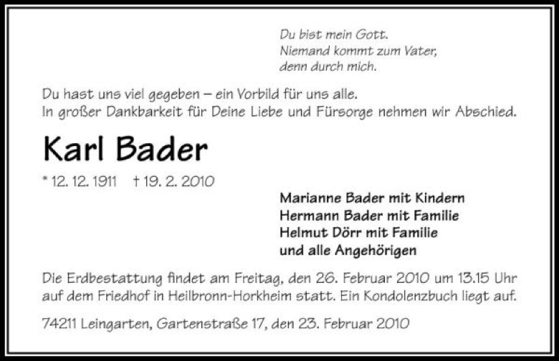 Hier finden Sie alle Traueranzeigen aus der Zeitung, die bisher für Karl Bader erschienen sind. Weitere Traueranzeigen, die in der Zeitung erscheinen, werden hier ebenfalls aufgelistet