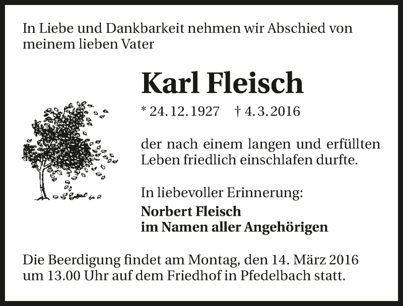 Hier finden Sie alle Traueranzeigen aus der Zeitung, die bisher für Karl Fleisch erschienen sind. Weitere Traueranzeigen, die in der Zeitung erscheinen, werden hier ebenfalls aufgelistet