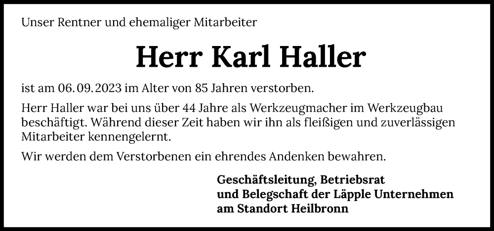 Hier finden Sie alle Traueranzeigen aus der Zeitung, die bisher für Karl Haller erschienen sind. Weitere Traueranzeigen, die in der Zeitung erscheinen, werden hier ebenfalls aufgelistet