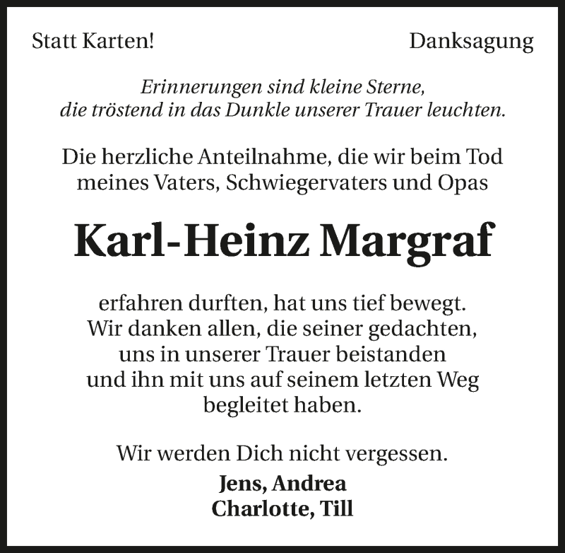 Hier finden Sie alle Traueranzeigen aus der Zeitung, die bisher für Karl-Heinz Margraf erschienen sind. Weitere Traueranzeigen, die in der Zeitung erscheinen, werden hier ebenfalls aufgelistet