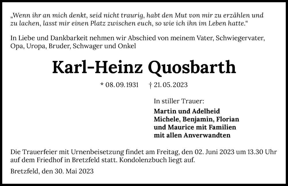 Hier finden Sie alle Traueranzeigen aus der Zeitung, die bisher für Karl-Heinz Quosbarth erschienen sind. Weitere Traueranzeigen, die in der Zeitung erscheinen, werden hier ebenfalls aufgelistet