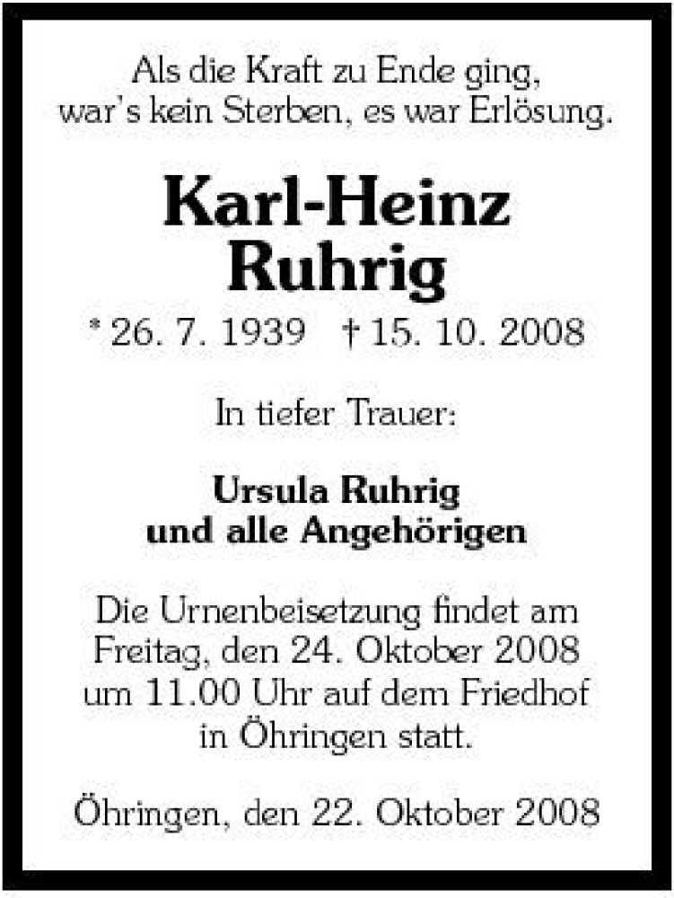 Hier finden Sie alle Traueranzeigen aus der Zeitung, die bisher für Karl-Heinz Ruhrig erschienen sind. Weitere Traueranzeigen, die in der Zeitung erscheinen, werden hier ebenfalls aufgelistet