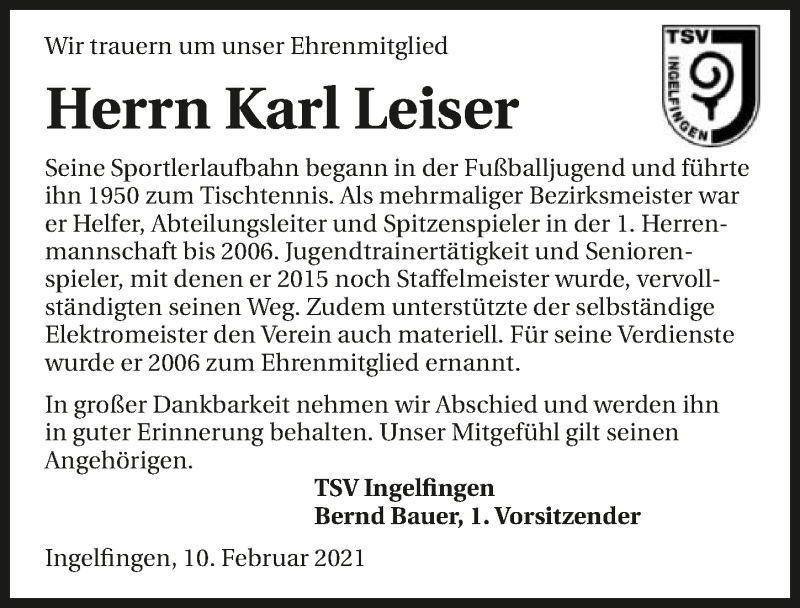 Hier finden Sie alle Traueranzeigen aus der Zeitung, die bisher für Karl Leiser erschienen sind. Weitere Traueranzeigen, die in der Zeitung erscheinen, werden hier ebenfalls aufgelistet