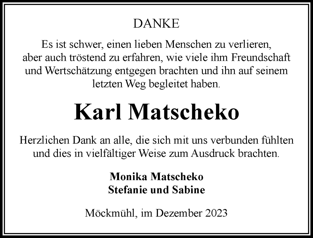 Hier finden Sie alle Traueranzeigen aus der Zeitung, die bisher für Karl Matscheko erschienen sind. Weitere Traueranzeigen, die in der Zeitung erscheinen, werden hier ebenfalls aufgelistet
