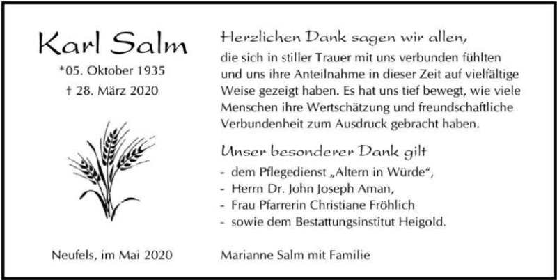 Hier finden Sie alle Traueranzeigen aus der Zeitung, die bisher für Karl Salm erschienen sind. Weitere Traueranzeigen, die in der Zeitung erscheinen, werden hier ebenfalls aufgelistet