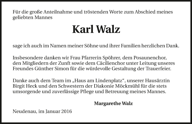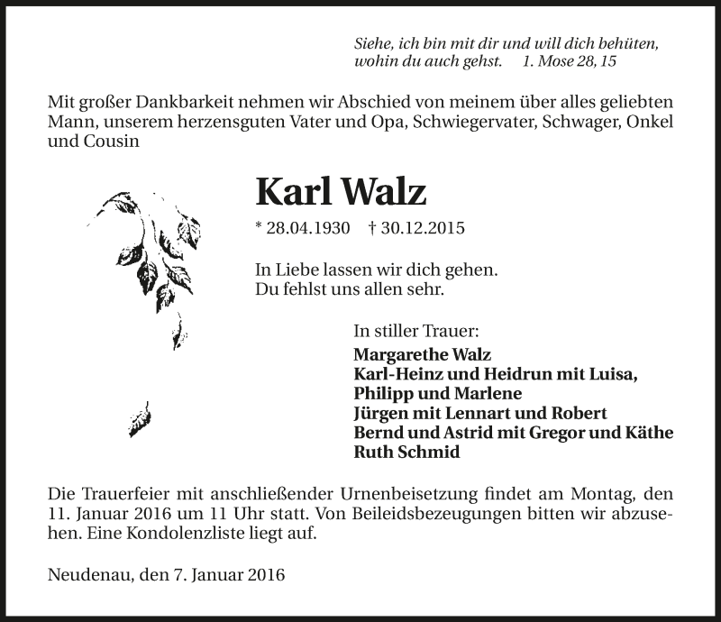 Hier finden Sie alle Traueranzeigen aus der Zeitung, die bisher für Karl Walz erschienen sind. Weitere Traueranzeigen, die in der Zeitung erscheinen, werden hier ebenfalls aufgelistet