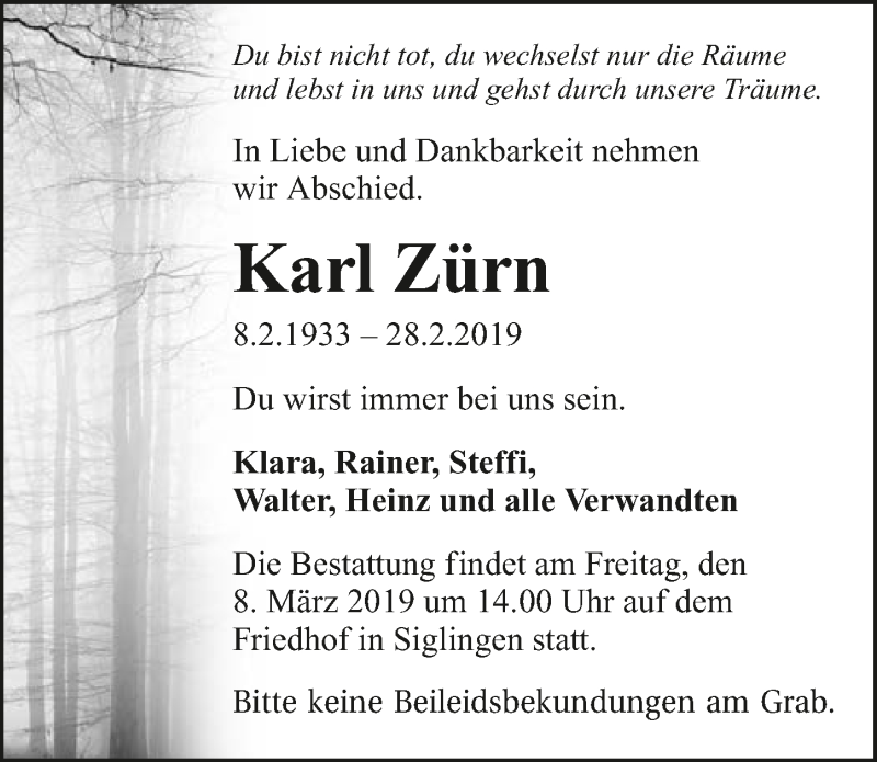 Hier finden Sie alle Traueranzeigen aus der Zeitung, die bisher für Karl Zürn erschienen sind. Weitere Traueranzeigen, die in der Zeitung erscheinen, werden hier ebenfalls aufgelistet