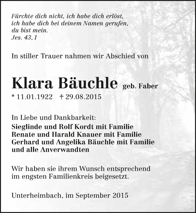 Hier finden Sie alle Traueranzeigen aus der Zeitung, die bisher für Klara Bäuchle erschienen sind. Weitere Traueranzeigen, die in der Zeitung erscheinen, werden hier ebenfalls aufgelistet