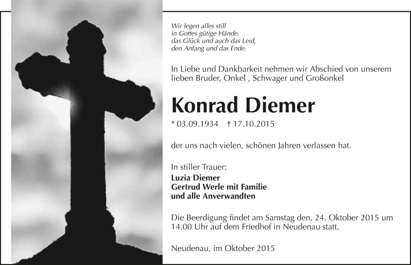 Hier finden Sie alle Traueranzeigen aus der Zeitung, die bisher für Konrad Diemer erschienen sind. Weitere Traueranzeigen, die in der Zeitung erscheinen, werden hier ebenfalls aufgelistet