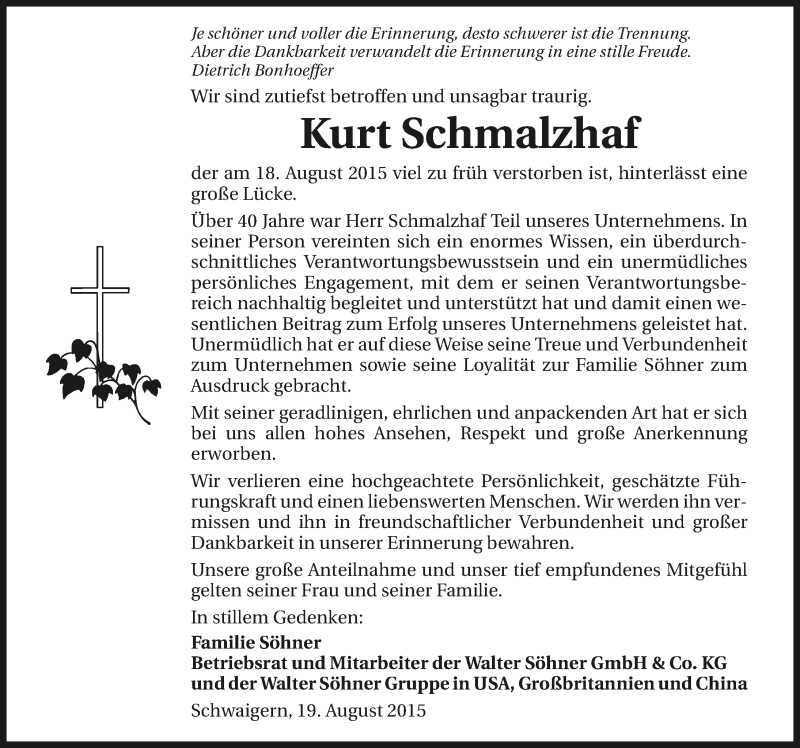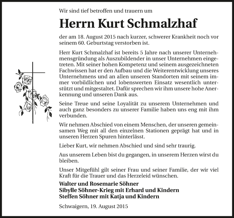 Hier finden Sie alle Traueranzeigen aus der Zeitung, die bisher für Kurt Schmalzhaf erschienen sind. Weitere Traueranzeigen, die in der Zeitung erscheinen, werden hier ebenfalls aufgelistet