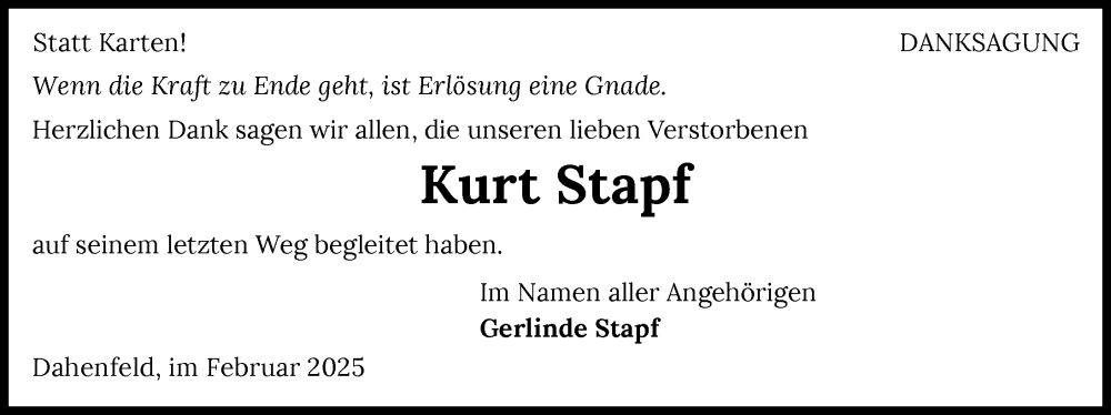Hier finden Sie alle Traueranzeigen aus der Zeitung, die bisher für Kurt Stapf erschienen sind. Weitere Traueranzeigen, die in der Zeitung erscheinen, werden hier ebenfalls aufgelistet
