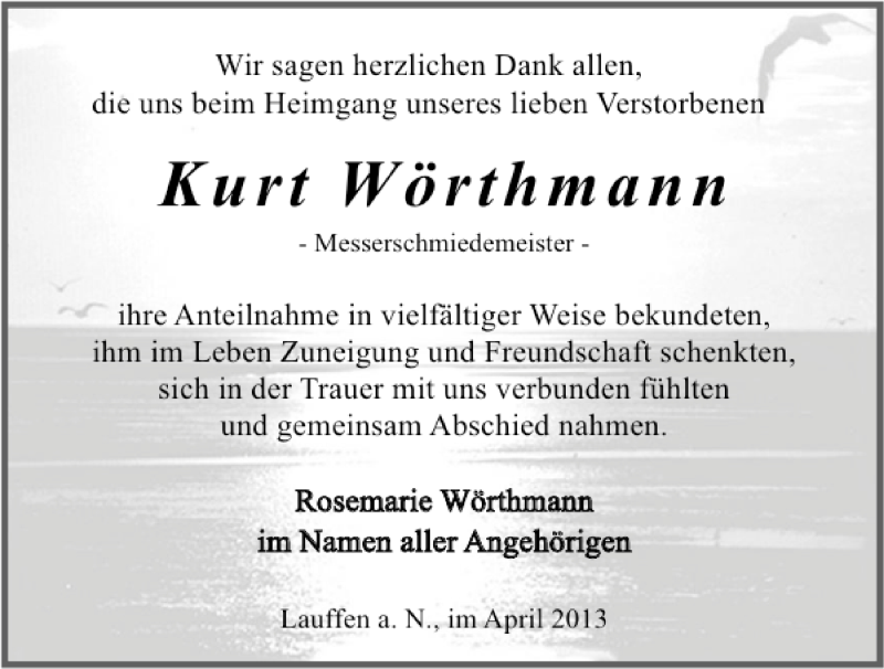 Hier finden Sie alle Traueranzeigen aus der Zeitung, die bisher für Kurt Wörthmann erschienen sind. Weitere Traueranzeigen, die in der Zeitung erscheinen, werden hier ebenfalls aufgelistet