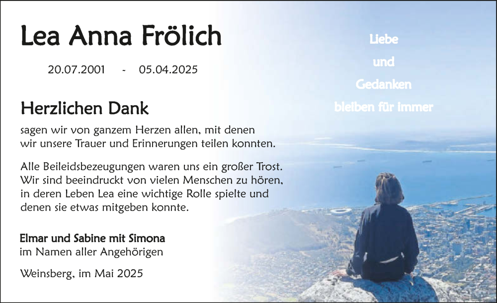 Hier finden Sie alle Traueranzeigen aus der Zeitung, die bisher für Lea Anna Frölich erschienen sind. Weitere Traueranzeigen, die in der Zeitung erscheinen, werden hier ebenfalls aufgelistet