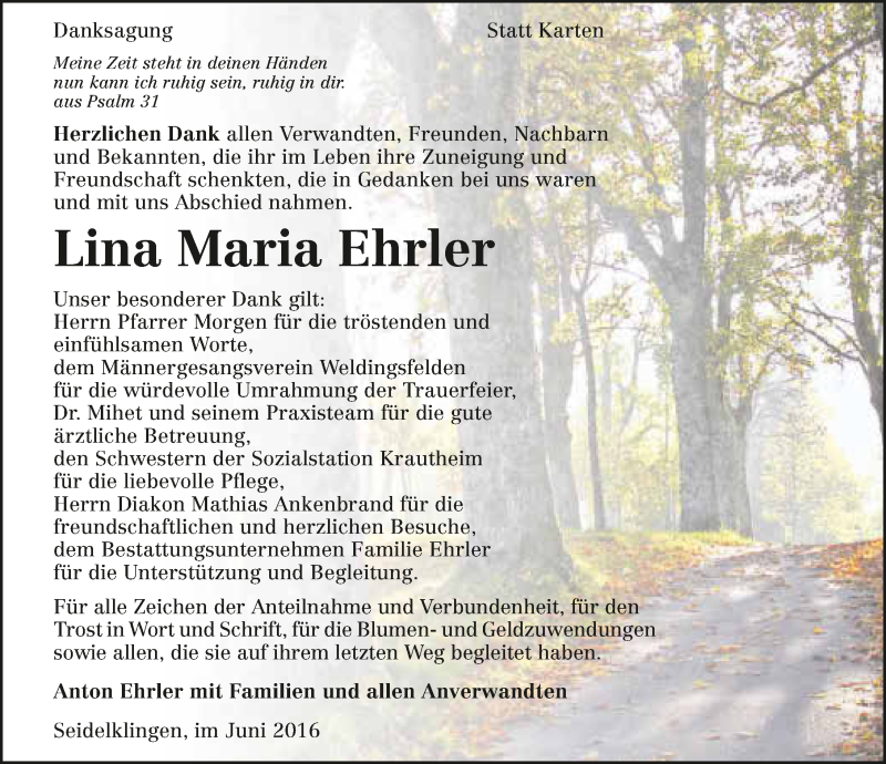 Hier finden Sie alle Traueranzeigen aus der Zeitung, die bisher für Lina Maria Ehrler erschienen sind. Weitere Traueranzeigen, die in der Zeitung erscheinen, werden hier ebenfalls aufgelistet