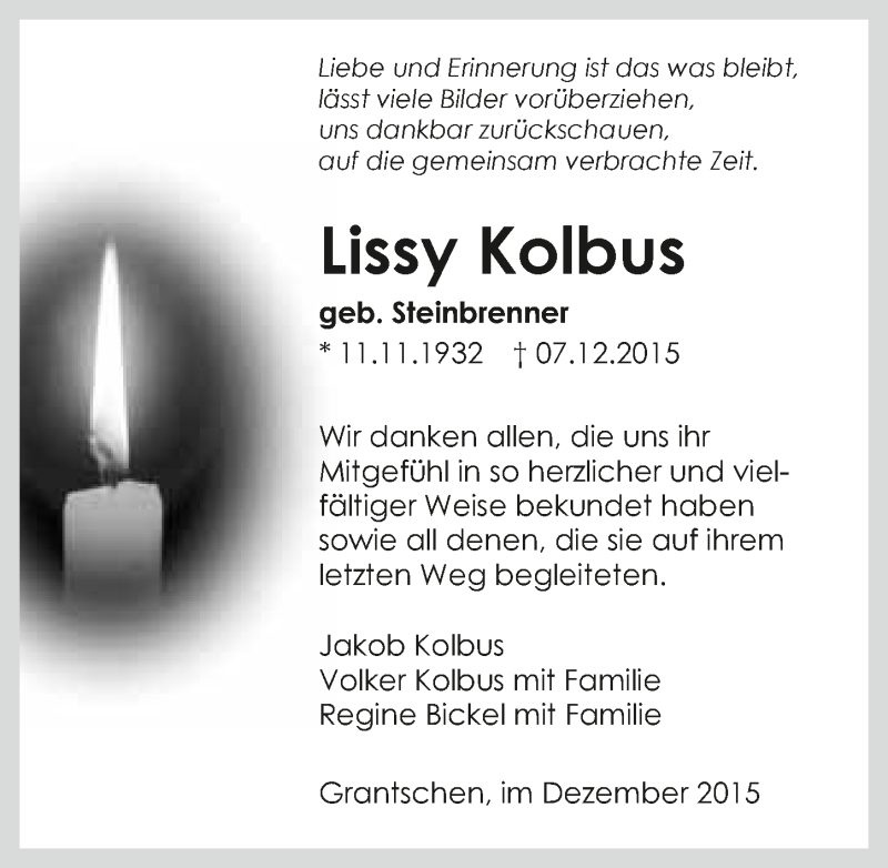 Hier finden Sie alle Traueranzeigen aus der Zeitung, die bisher für Lissy Kolbus erschienen sind. Weitere Traueranzeigen, die in der Zeitung erscheinen, werden hier ebenfalls aufgelistet
