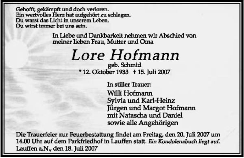 Hier finden Sie alle Traueranzeigen aus der Zeitung, die bisher für Lore Hofmann erschienen sind. Weitere Traueranzeigen, die in der Zeitung erscheinen, werden hier ebenfalls aufgelistet