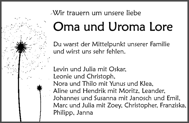 Hier finden Sie alle Traueranzeigen aus der Zeitung, die bisher für Lore Kurz erschienen sind. Weitere Traueranzeigen, die in der Zeitung erscheinen, werden hier ebenfalls aufgelistet