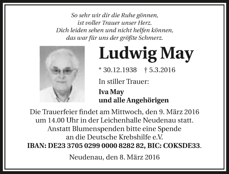 Hier finden Sie alle Traueranzeigen aus der Zeitung, die bisher für Ludwig May erschienen sind. Weitere Traueranzeigen, die in der Zeitung erscheinen, werden hier ebenfalls aufgelistet