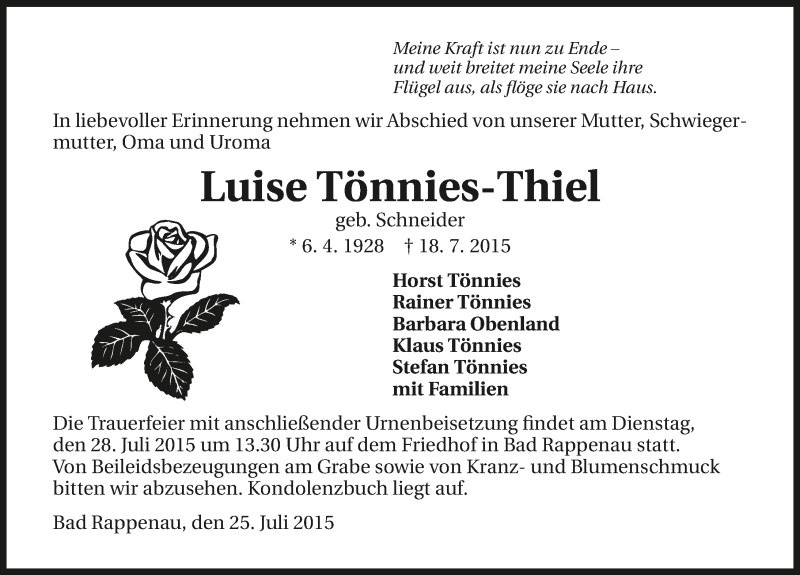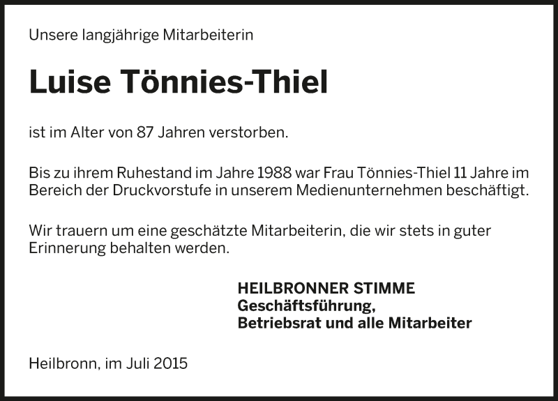 Hier finden Sie alle Traueranzeigen aus der Zeitung, die bisher für Luise Tönnies-Thiel erschienen sind. Weitere Traueranzeigen, die in der Zeitung erscheinen, werden hier ebenfalls aufgelistet
