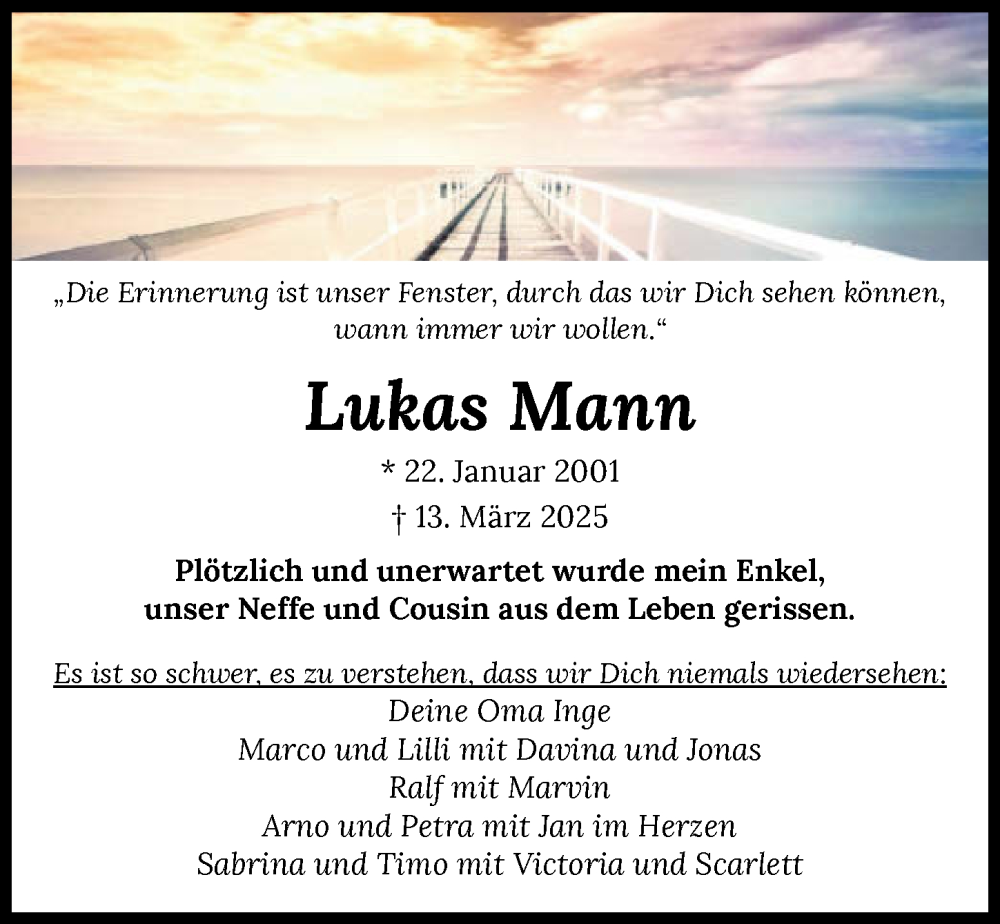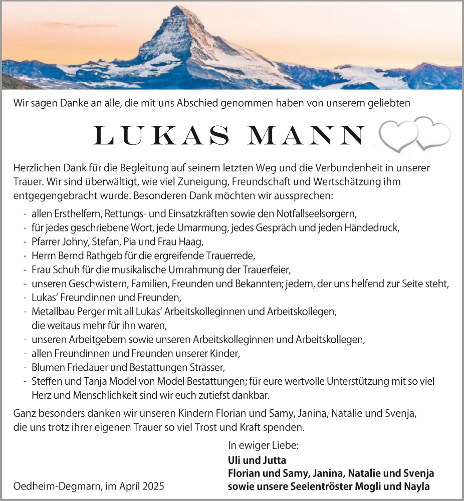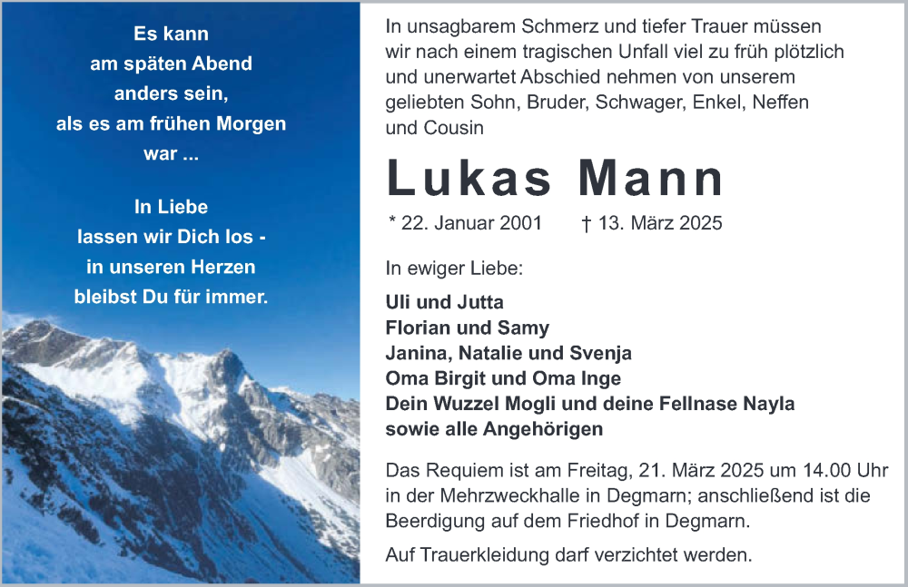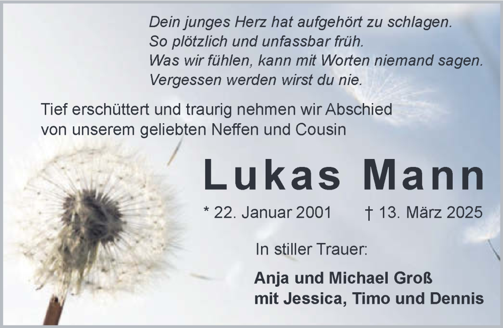 Hier finden Sie alle Traueranzeigen aus der Zeitung, die bisher für Lukas Mann erschienen sind. Weitere Traueranzeigen, die in der Zeitung erscheinen, werden hier ebenfalls aufgelistet