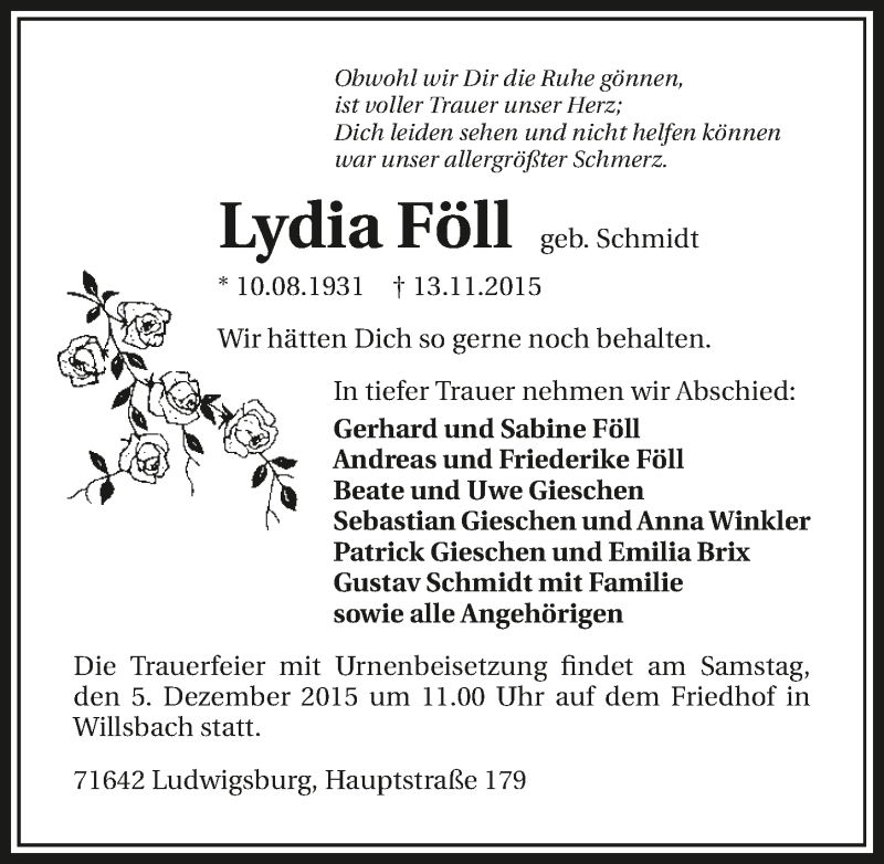 Hier finden Sie alle Traueranzeigen aus der Zeitung, die bisher für Lydia Föll erschienen sind. Weitere Traueranzeigen, die in der Zeitung erscheinen, werden hier ebenfalls aufgelistet