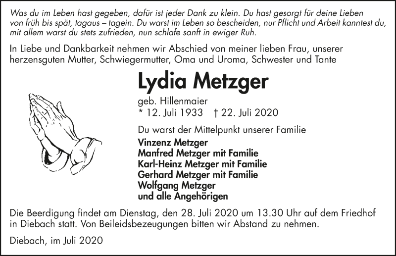 Hier finden Sie alle Traueranzeigen aus der Zeitung, die bisher für Lydia Metzger erschienen sind. Weitere Traueranzeigen, die in der Zeitung erscheinen, werden hier ebenfalls aufgelistet