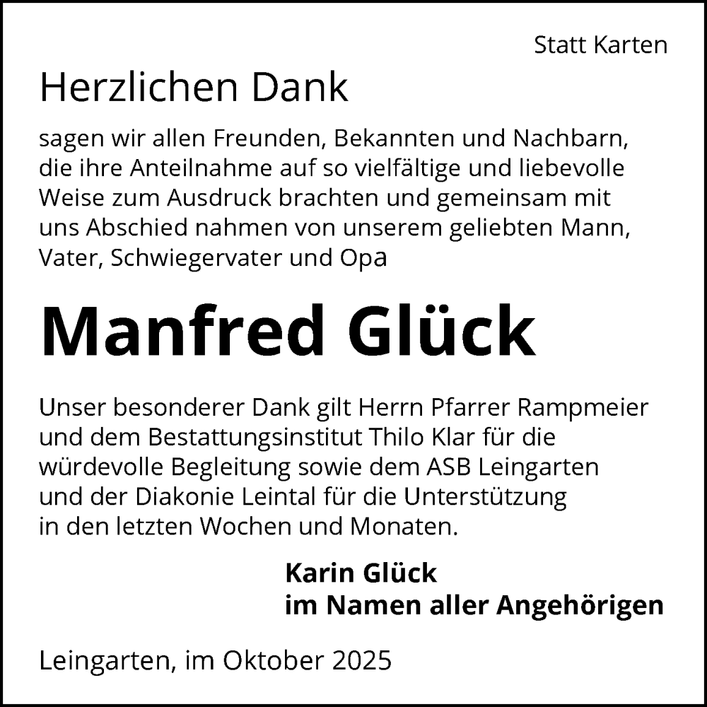 Hier finden Sie alle Traueranzeigen aus der Zeitung, die bisher für Manfred Glück erschienen sind. Weitere Traueranzeigen, die in der Zeitung erscheinen, werden hier ebenfalls aufgelistet