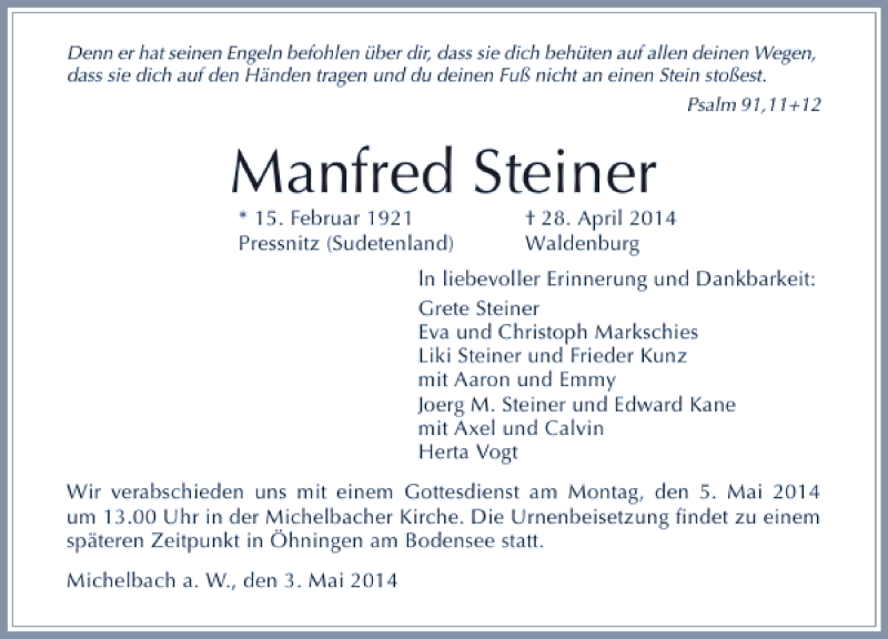 Hier finden Sie alle Traueranzeigen aus der Zeitung, die bisher für Manfred Steiner erschienen sind. Weitere Traueranzeigen, die in der Zeitung erscheinen, werden hier ebenfalls aufgelistet