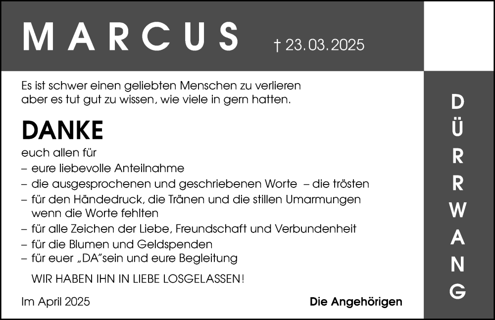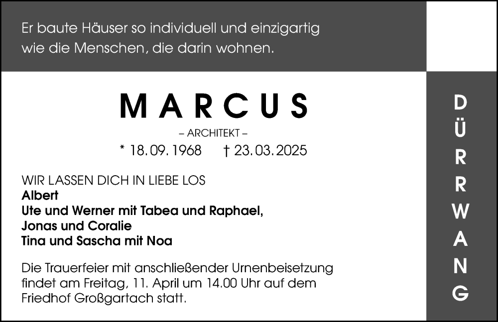 Hier finden Sie alle Traueranzeigen aus der Zeitung, die bisher für Marcus Dürrwang erschienen sind. Weitere Traueranzeigen, die in der Zeitung erscheinen, werden hier ebenfalls aufgelistet