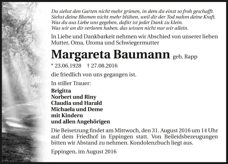 Hier finden Sie alle Traueranzeigen aus der Zeitung, die bisher für Margareta Baumann erschienen sind. Weitere Traueranzeigen, die in der Zeitung erscheinen, werden hier ebenfalls aufgelistet