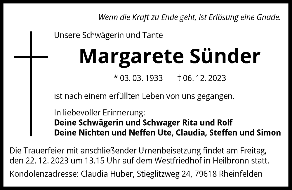 Hier finden Sie alle Traueranzeigen aus der Zeitung, die bisher für Margarete Sünder erschienen sind. Weitere Traueranzeigen, die in der Zeitung erscheinen, werden hier ebenfalls aufgelistet