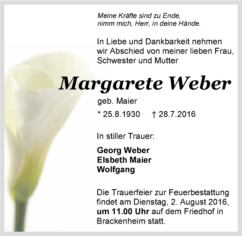Hier finden Sie alle Traueranzeigen aus der Zeitung, die bisher für Margarete Weber erschienen sind. Weitere Traueranzeigen, die in der Zeitung erscheinen, werden hier ebenfalls aufgelistet