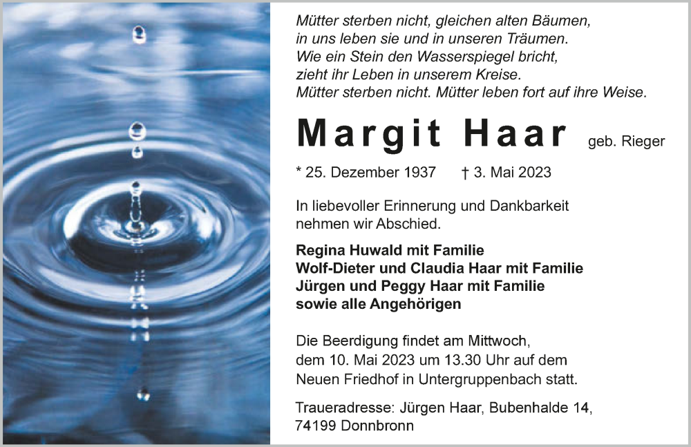 Hier finden Sie alle Traueranzeigen aus der Zeitung, die bisher für Margit Haar erschienen sind. Weitere Traueranzeigen, die in der Zeitung erscheinen, werden hier ebenfalls aufgelistet